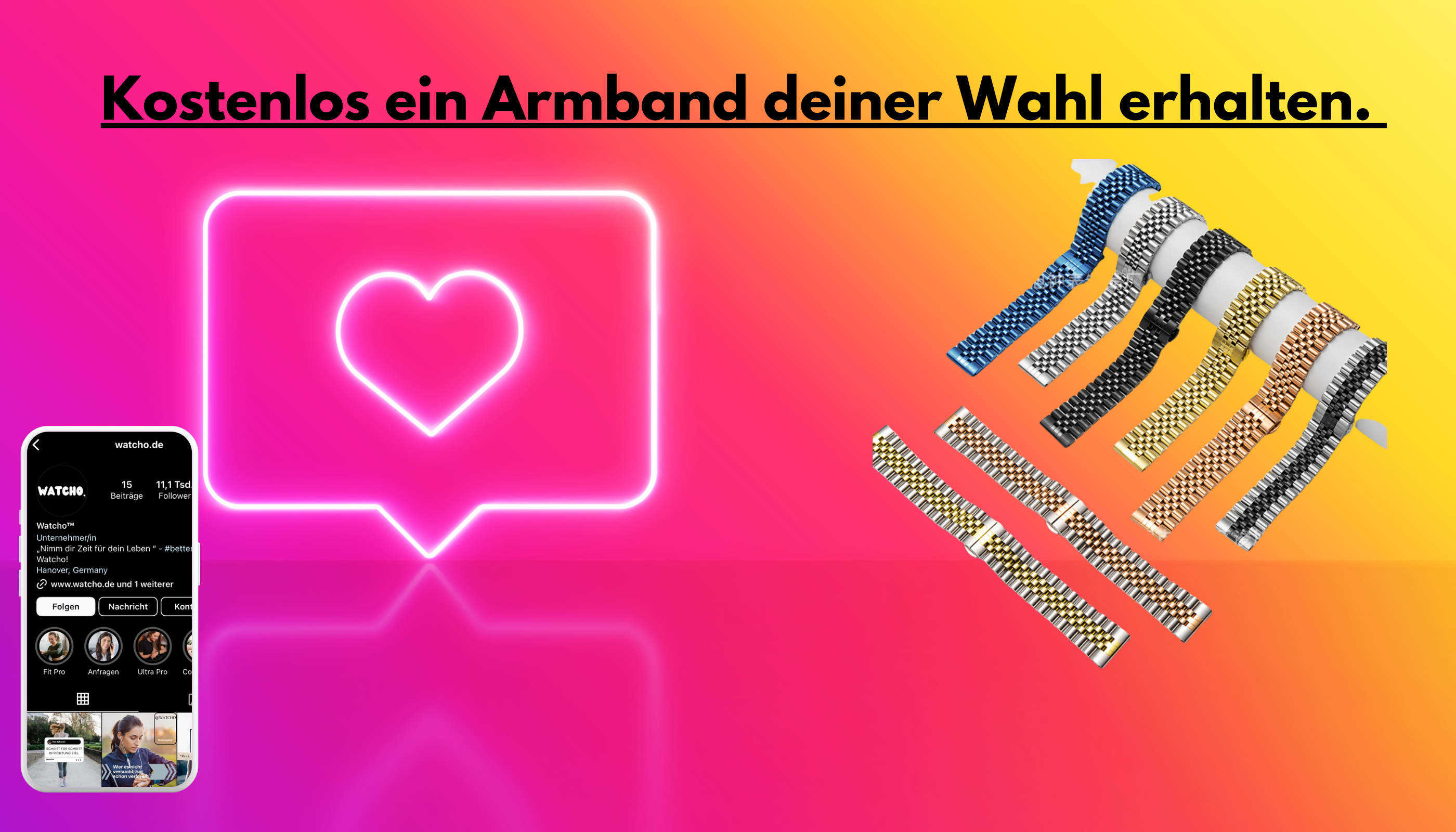 3. Sende uns einen Screenshot Beweis an shop@watcho.de und erhält deinen Code zum Bestellen des kostenlosen Armbands deiner Wahl