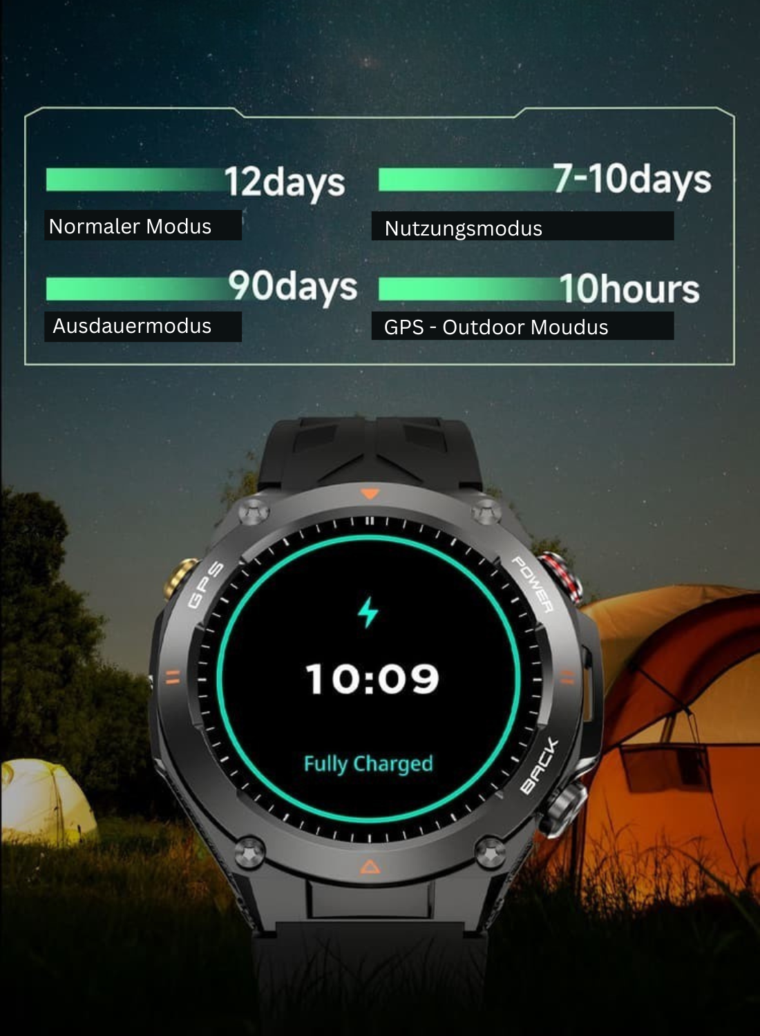 Unsere Herren-Smartwatch bietet eine lange Akkulaufzeit, damit du den ganzen Tag verbunden bleibst – ohne ständiges Aufladen. Zuverlässig, effizient und bereit für jedes Abenteuer!